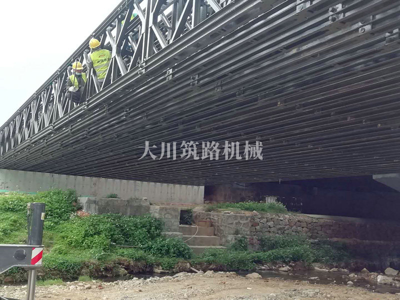 鋼橋型號(hào):48m*16m加強(qiáng)型6(車道)+2(人行通道)+防撞護(hù)欄,上承式鋼橋,橫向布置35排貝雷梁,分兩跨,橋墩為單排四柱式φ800鋼管樁,上表鋪混泥土。